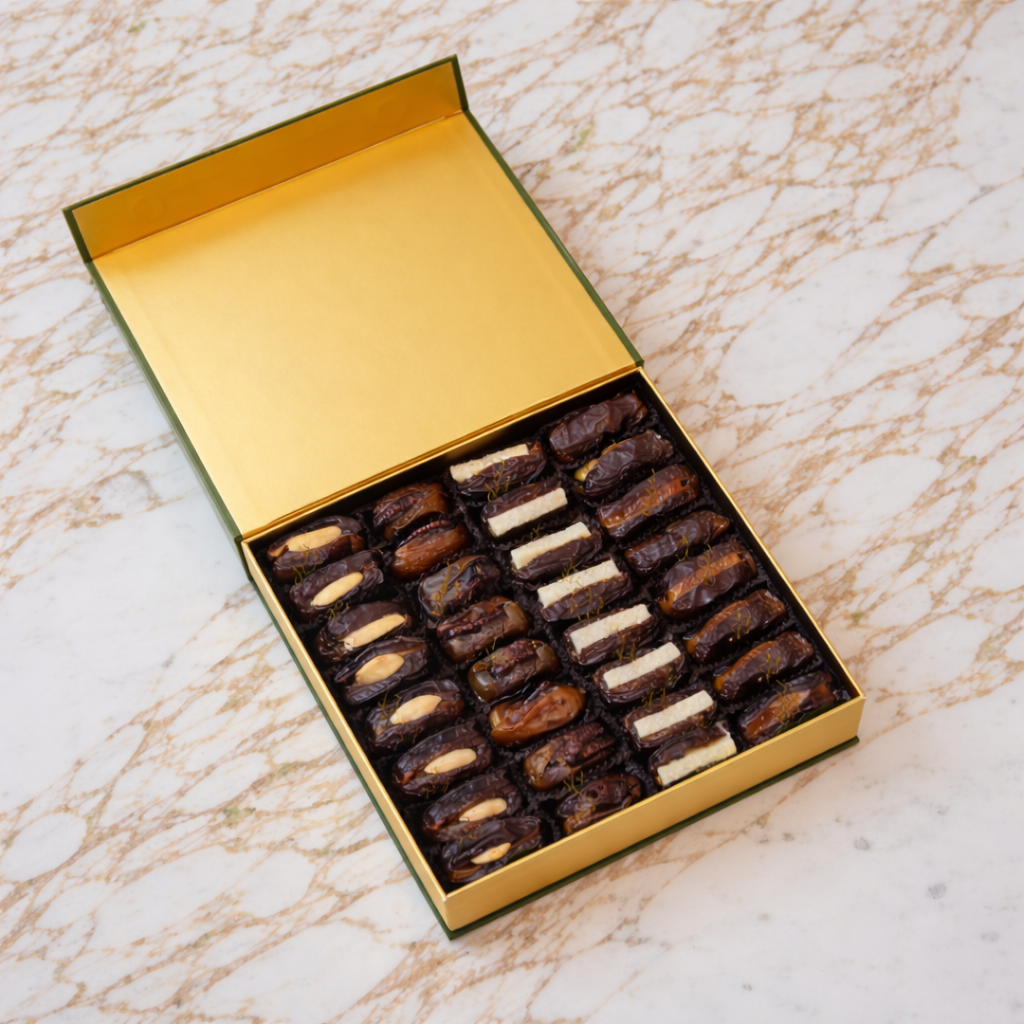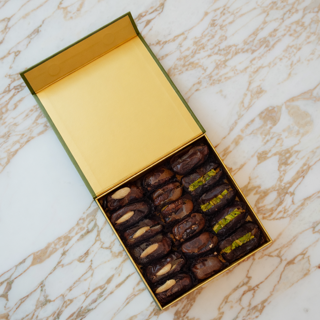 A refined assortment of premium dates generously filled with roasted almonds, pistachios, and pecans, candied orange peel, and coconut. Perfect for gifting or a personal treat.